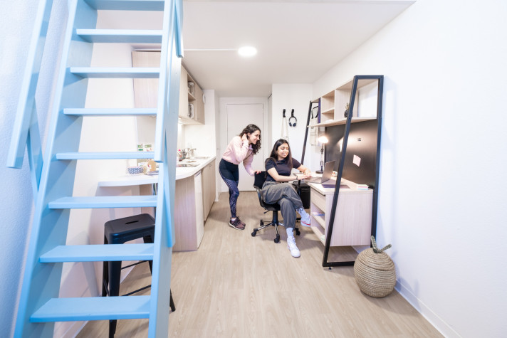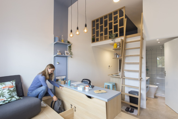 Elle s’étend sur 8 niveaux (rez de chaussée au 7ème étage) et est composée de 404 logements allant du studio de 18m2 à 32m2 aux colocations (T3, T5, T6, T7) et peut ainsi accueillir jusqu’à 463 locataires.
